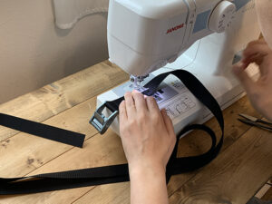 ベルトをバックルに通し、ベルトを固定する為に縫い付けをします。